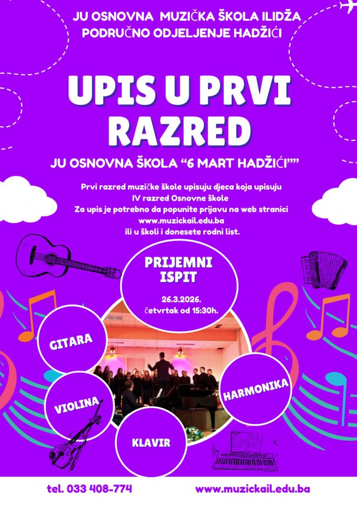 • 26. marta 2026. godine – prijemni ispit u područnom odjeljenju u Hadžićima (JU OŠ “6 MART HADŽIĆI”) od 15:30 sati